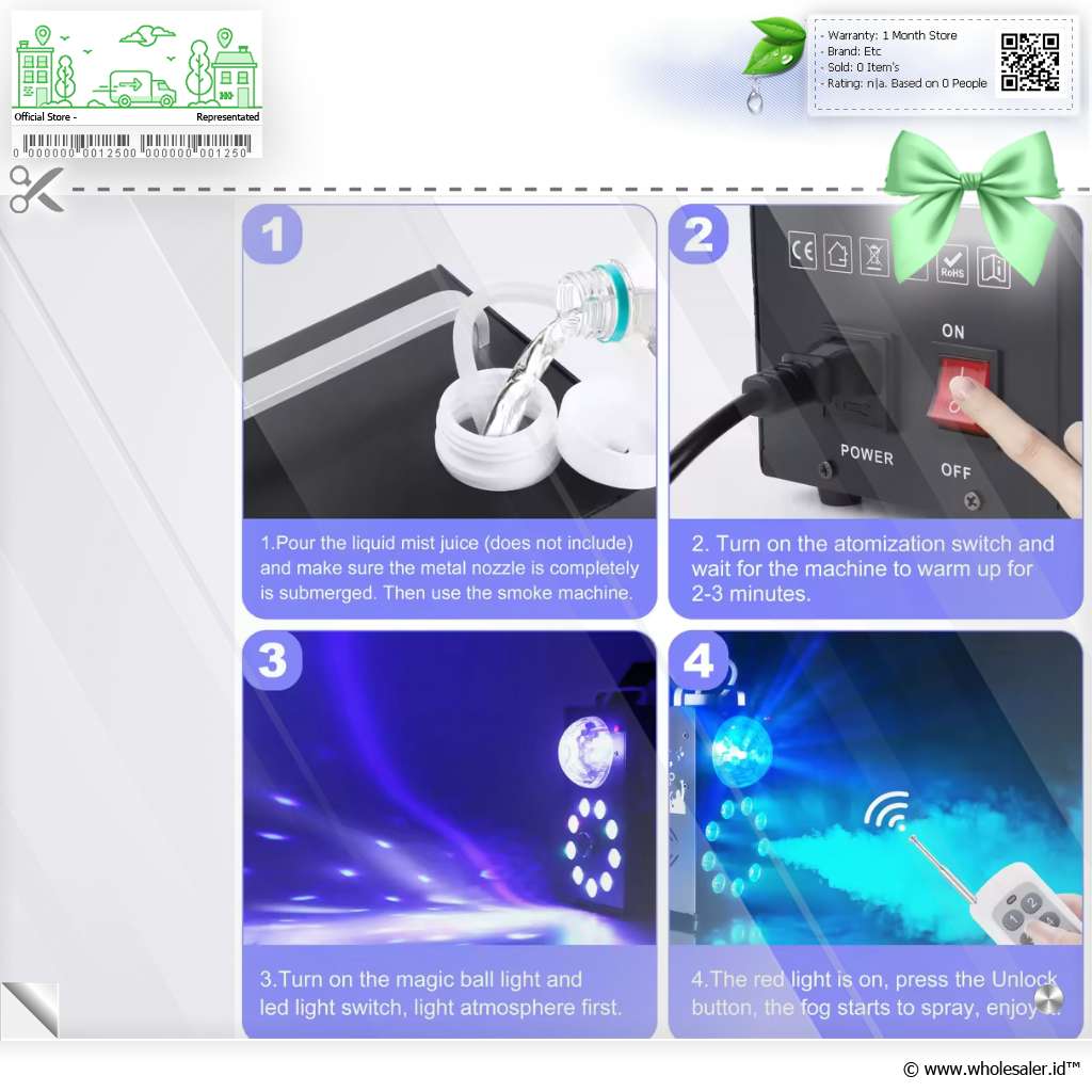 | Kendali Penuh dengan Remote Control Nirkabel Dilengkapi remote control praktis, Anda bisa mengatur semua fungsi secara mudah, mulai dari semprotan asap, pengaturan lampu, hingga efek warna. Ketiga fungsi dapat dikontrol secara terpisah untuk menyesuaikan suasana acara sesuai kebutuhan. |