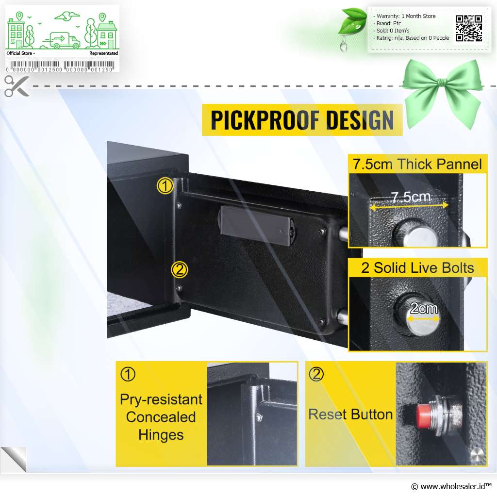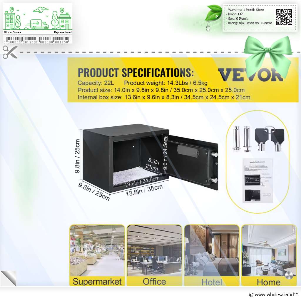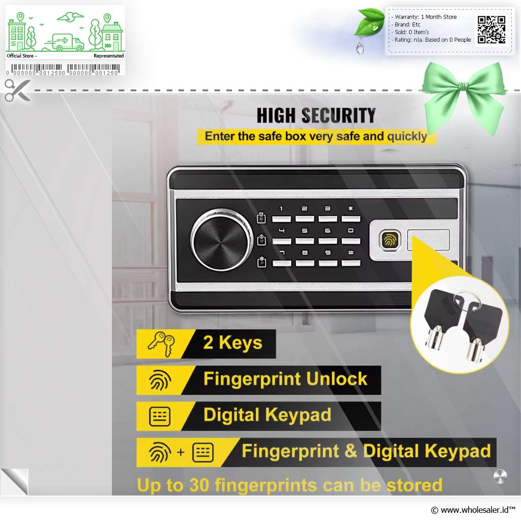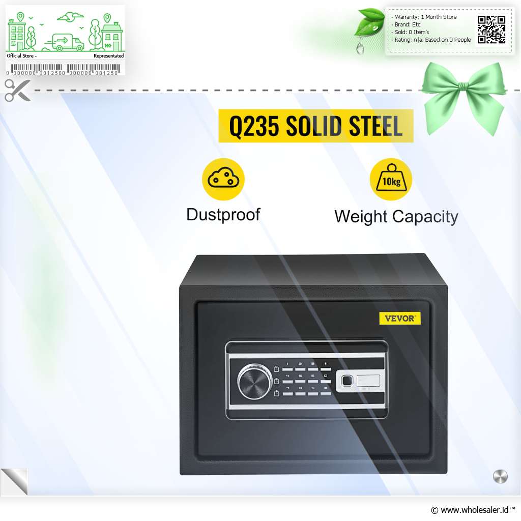 Kotak brankas Vevor dirancang untuk memberikan perlindungan maksimal terhadap barang berharga Anda dengan desain yang kompak dan efisien. Dengan dimensi 35 x 25 x 25 cm , brankas ini ideal untuk menyimpan dokumen penting, perhiasan, uang tunai, dan barang elektronik dalam satu tempat yang aman. Dilengkapi dengan 3 sistem penguncian, yaitu password, fingerprint, dan kunci manual yang akan menambah aman barang penting Anda.