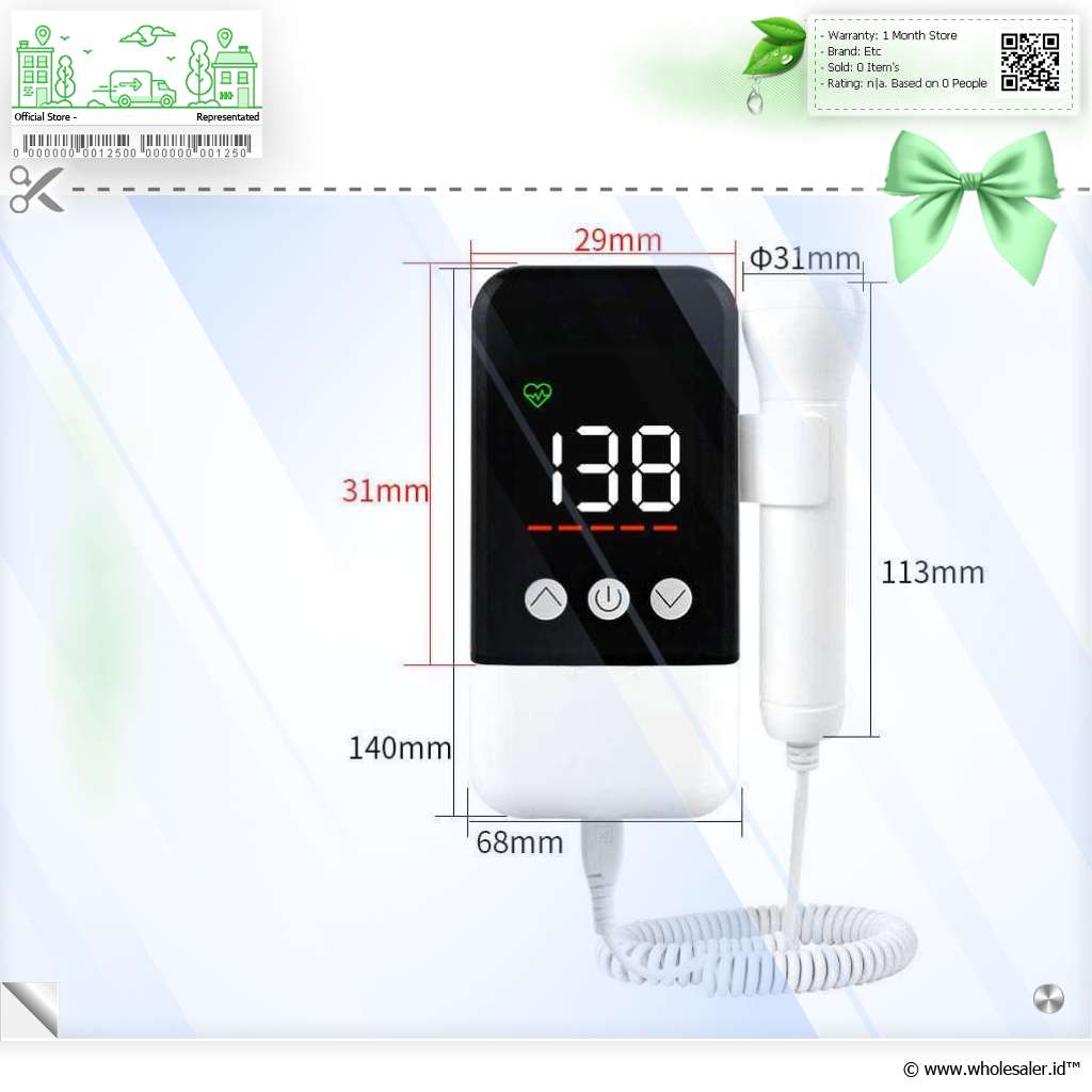 | Dimensi | : | Layar 31 x 29 mm Fetal Doppler 140 x 68 x 26 mm Probe 31 x 113 mm |