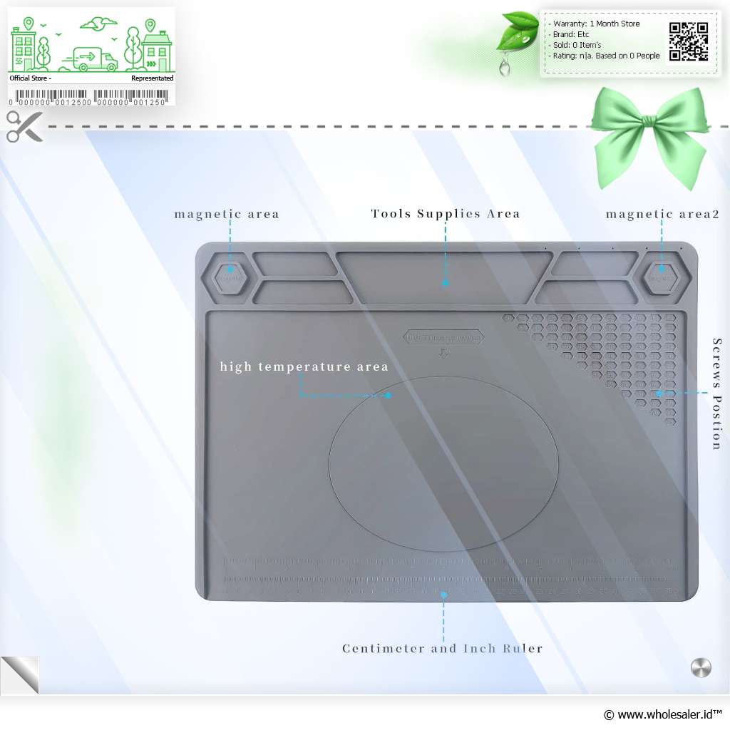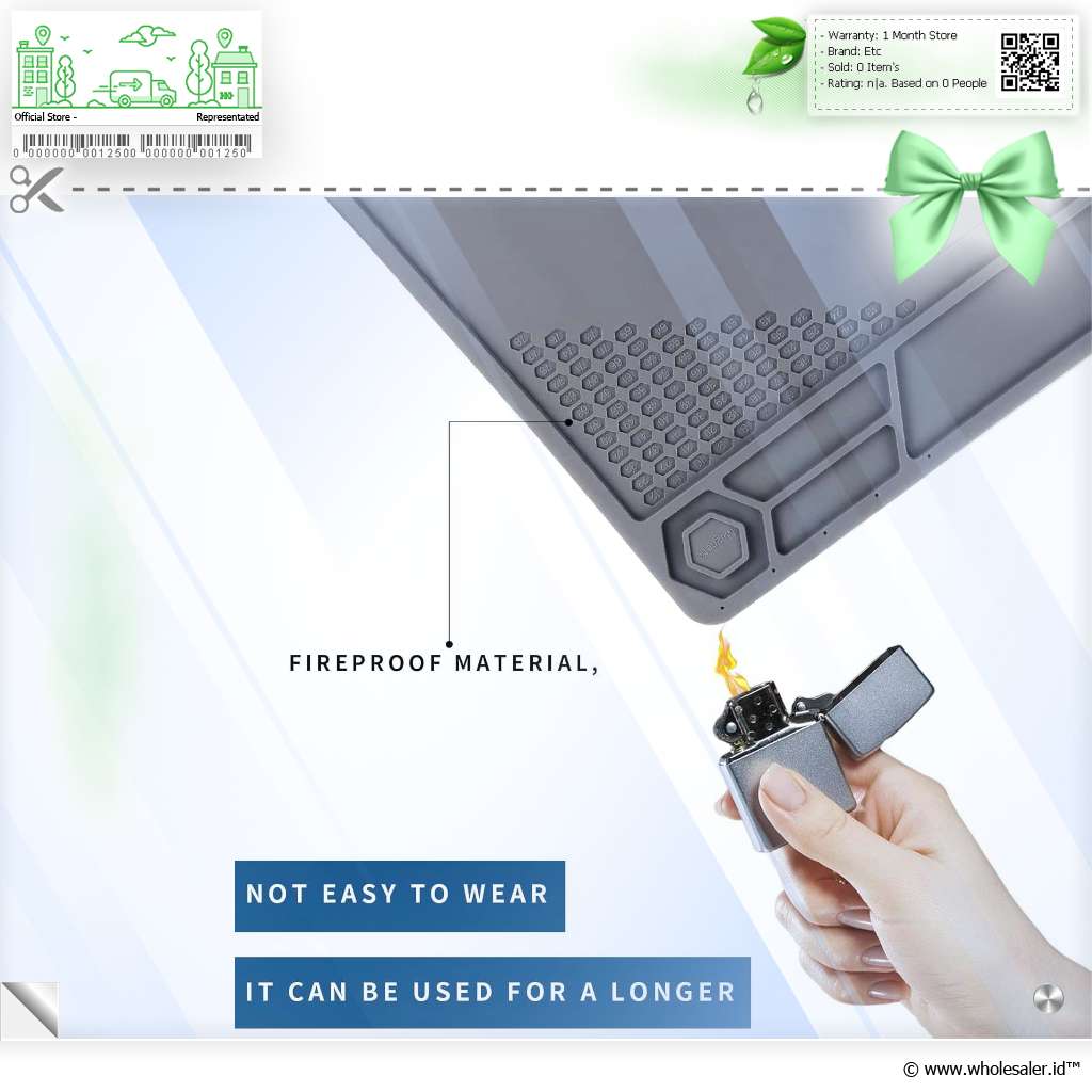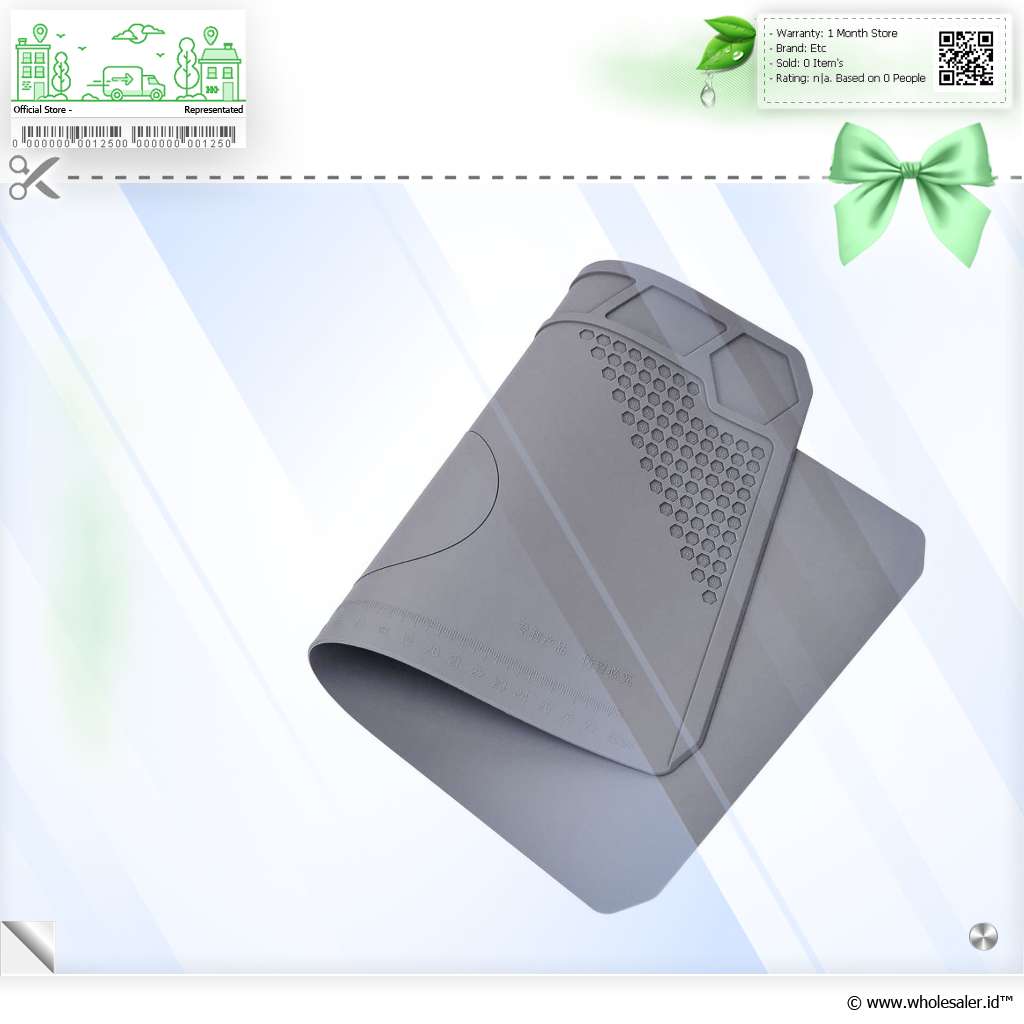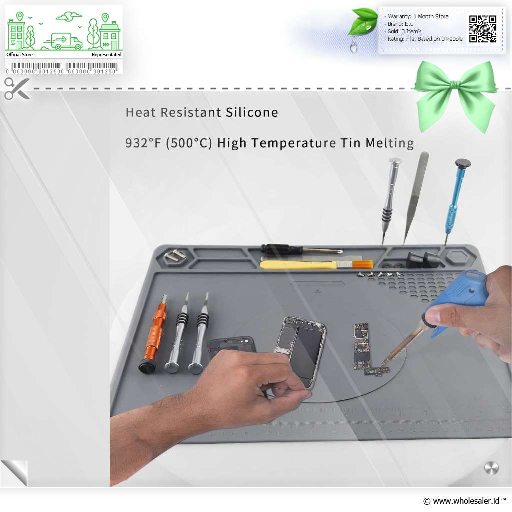 | Material Karet Silikon Mat ini terbuat dari karet silikon yang mampu menahan suhu sangat tinggi, hingga sekitar 500C. Dengan kemampuan ini, Anda bisa meletakkan solder, hot air gun atau perangkat yang memancarkan panas langsung di atas alas kerja tanpa takut meja kerja atau permukaan lain rusak akibat panas. |
