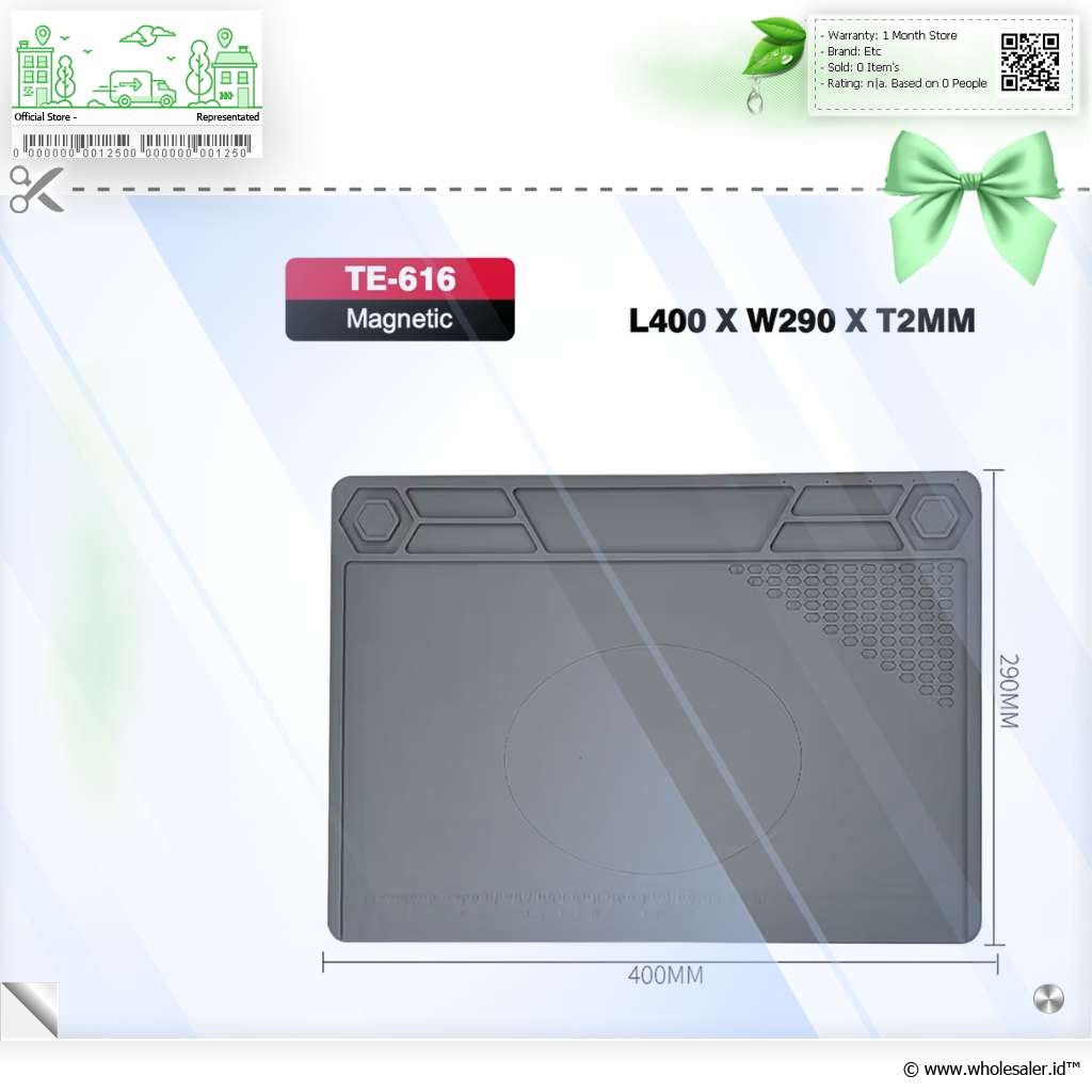 | Luas Cukup Untuk Matras Kerja Dengan dimensi sekitar 400 x 290 mm, TE616 menyediakan area kerja yang cukup luas untuk menampung perangkat seperti laptop, bagian motherboard, smartphone, alat servis dan komponen kecil secara bersamaan. Ukuran ini memungkinkan Anda mengatur ruang kerja dengan lebih leluasa, memudahkan pengerjaan dan pengorganisasian. |