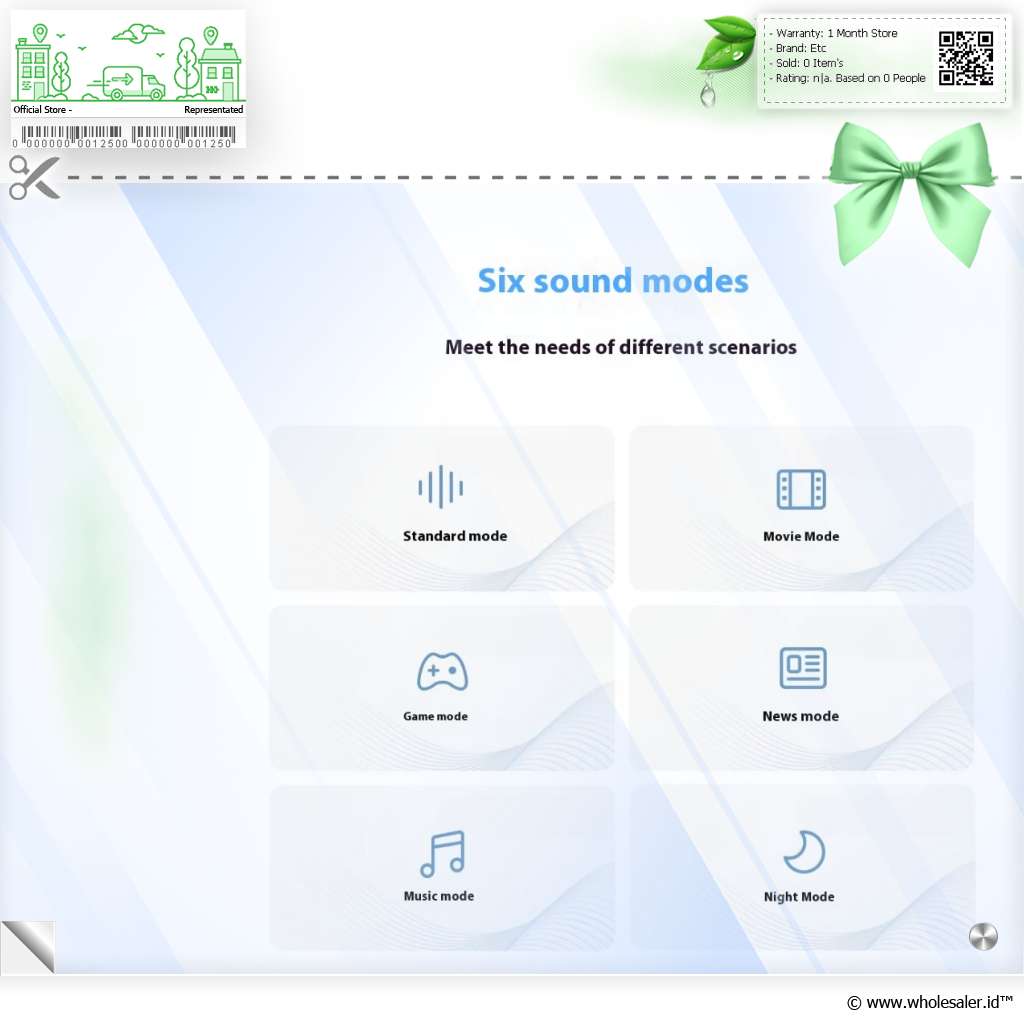 | 6 Mode Suara Fleksibel Atur penggunaan desktop speaker sesuai kebutuhan. 6 Pilihan mode yaitu, standar, movie, game, news, game, music, dan night cocok untuk menemani Anda menonton dan mendengarkan berbagai jenis audio. |