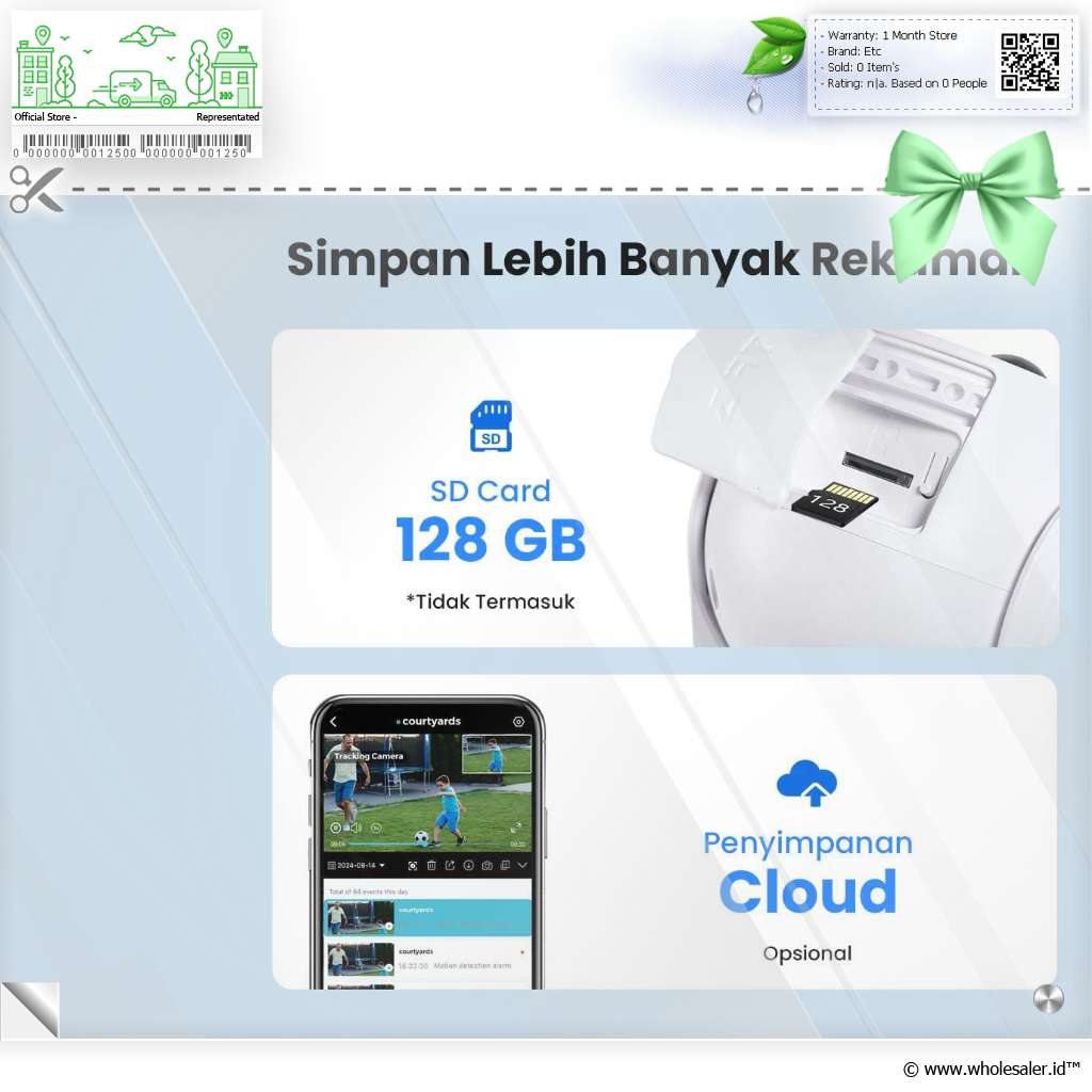 | Simpan Lebih Banyak Rekaman Slot pada TF Card dapat digunakan untuk kartu memori Micro SD dengan kapasitas hingga 128 GB. Anda juga dapat menggunakan penyimpanan cloud untuk menyimpan hasil rekaman secara online. |