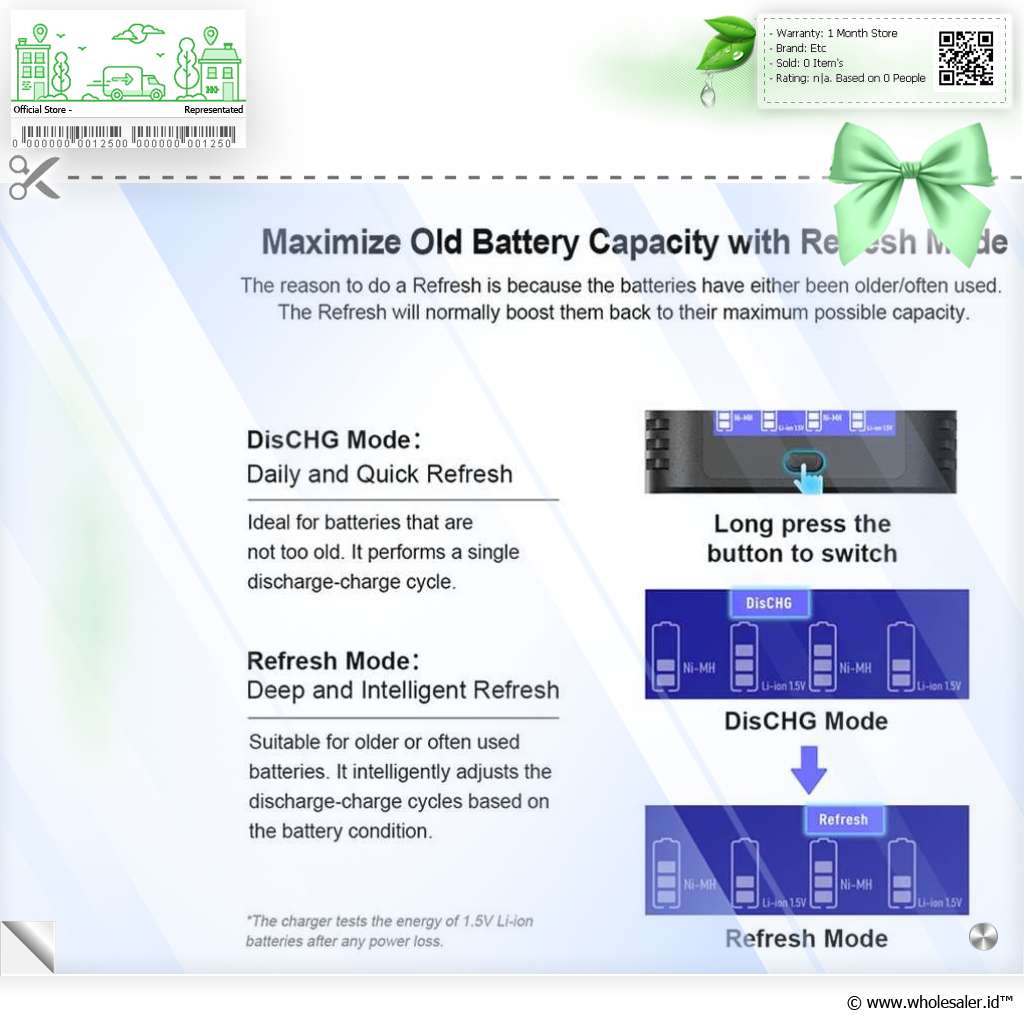 | Maksimalkan Kapasitas Baterai Charger baterai XTAR mampu menghidupkan kembali dan memaksimalkan baterai lama melalui dua mode penyegaran cerdas. DisCHG Mode menjaga performa baterai tetap stabil dan mengembalikan sebagian kapasitas yang mulai menurun, sementara Refresh Mode membantu mengembalikan kapasitas optimal baterai lama. |