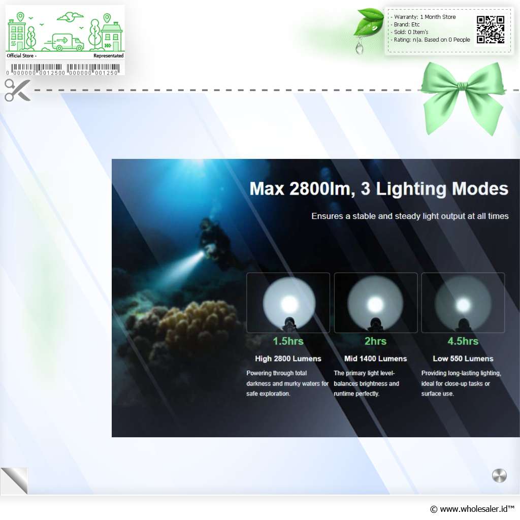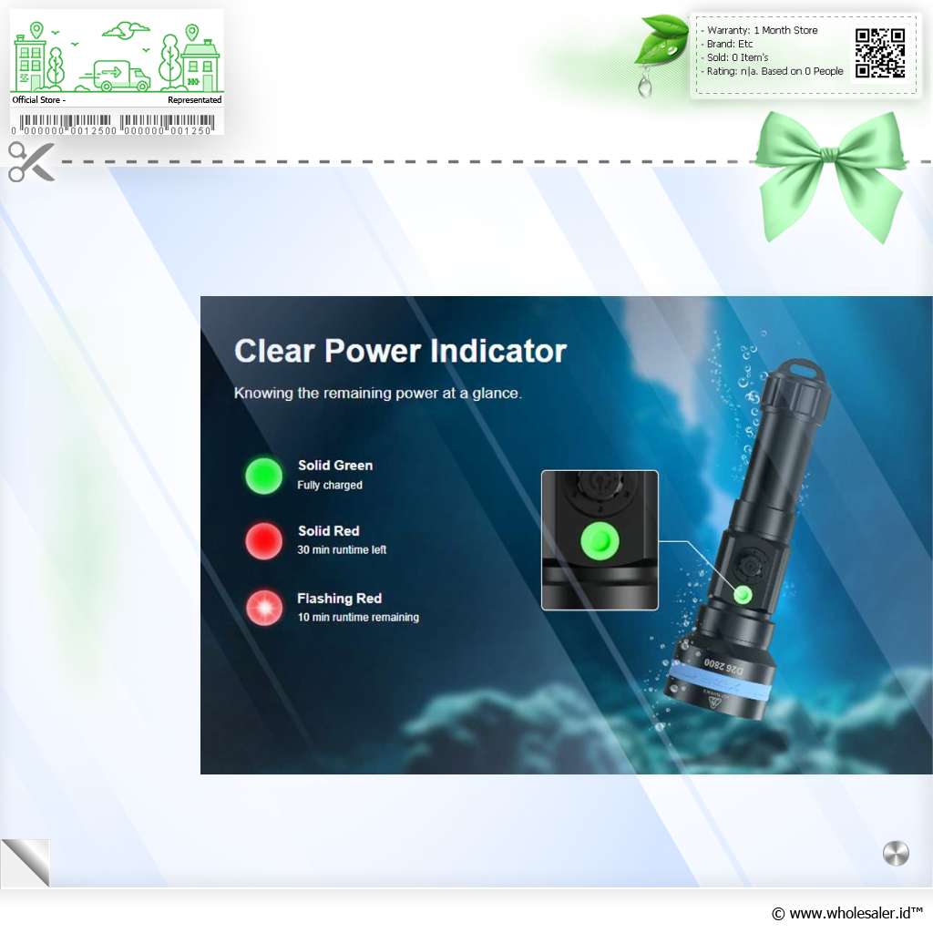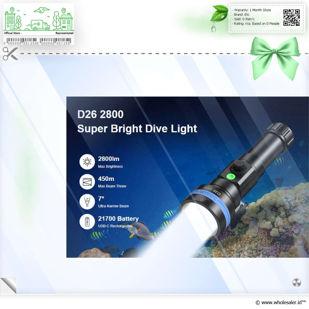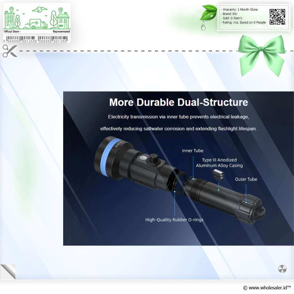 | Sempurna Untuk Menyelam Karena dibuat khusus untuk di dalam air, tentunya senter selam didesain memiliki ketahanan air yang sangat tinggi. Hadir dengan perlindungan IPX8 dengan ketahanan air hingga kedalaman 100 M, membuat senter selam ini alat yang sempurna untuk Anda bawa menyelam. Materialnya juga terbuat dari aluminium alloy yang tahan benturan dan tahan korosi. |