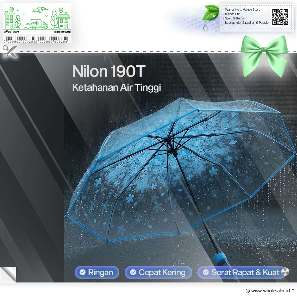 Material Nilon 190T Bahan nilon 190T yang digunakan tebal dan waterproof cegah bocor dan adanya air yang tembus ke dalam payung saat digunakan. |