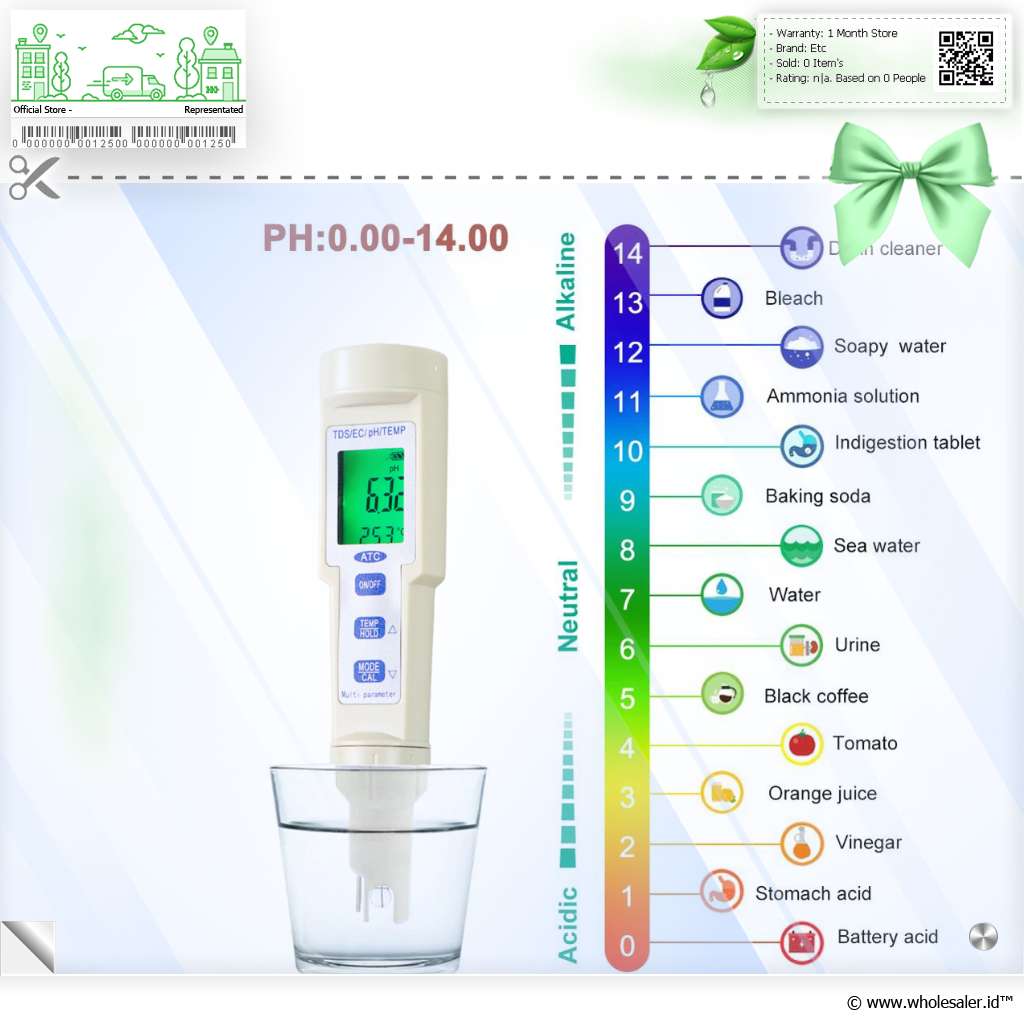 | Lain-lain | : | Baterai 3 x 1.5 V AG-13 (Sudah Terpasang) Rentang Asam pH 0014.00 pH, 019.9 ms/cm Rentang PPM 019990 ppm, 019.9 ppt Rentang Suhu 050 C (32 F-122 F) Akurasi Suhu 0.1 C (0.2 F) Akurasi Derajat Asam 0.03 pH |