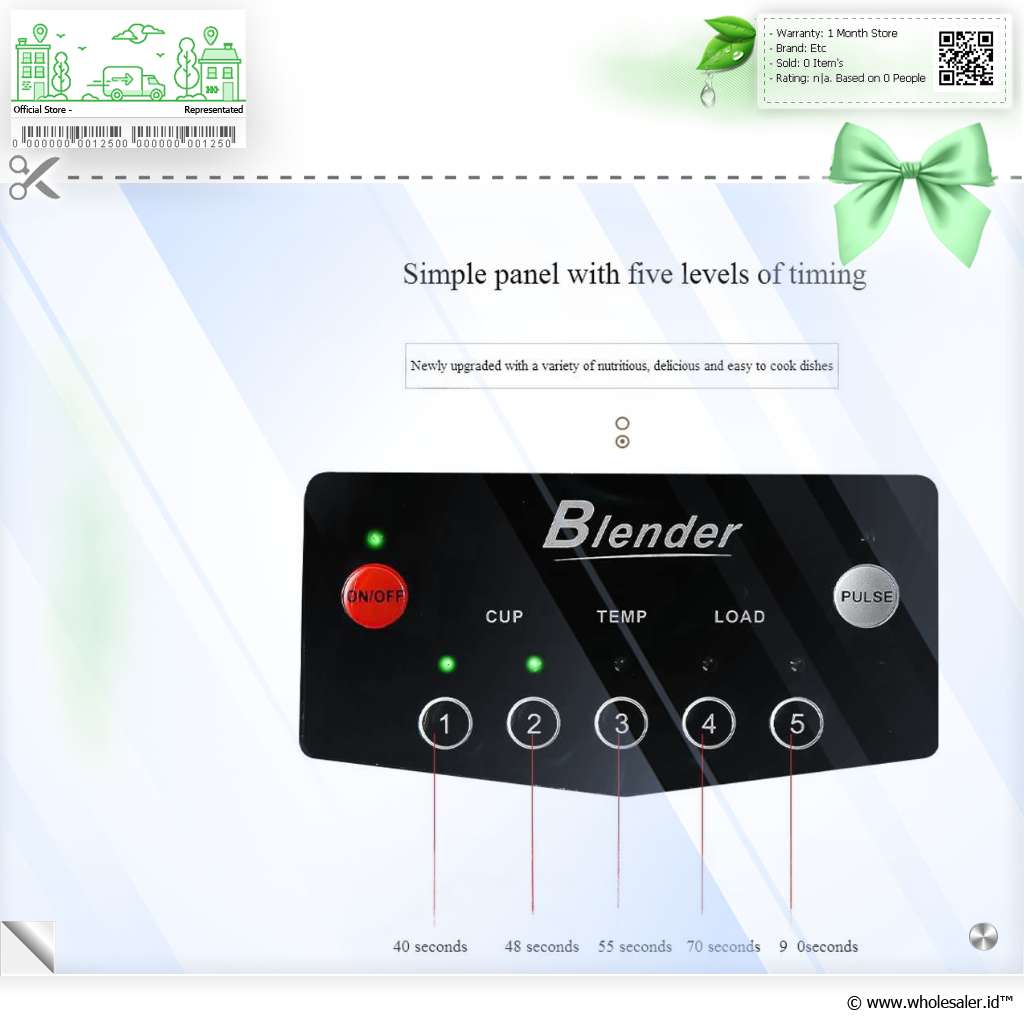 | Pilihan Timer Bervariasi Blender menggunakan mekanisme timer yang bisa Anda pilih sesuai kebutuhan mulai dari 40 detik, 48 detik, 55 detik, 70 detik, dan 90 detik. Penggunaan timer memastikan bahan diproses dalam durasi yang sama setiap kali, sehingga tekstur selalu seragam tanpa over-blend atau under-blend. Dengan timer, Anda cukup menekan tombol dan bisa melakukan aktivitas lain tanpa harus menunggu atau mematikan blender secara manual. |