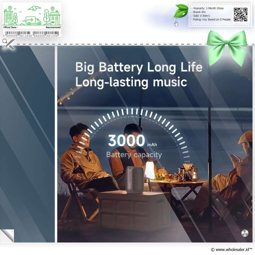 | Daya Tahan Hingga 15 Jam Speaker ini dilengkapi baterai berkapasitas 3000 mAh yang memungkinkan pemutaran musik hingga 15 jam nonstop (tergantung volume dan penggunaan). Pengisian cepat dengan voltase DC 5 V, dan tegangan kerja 3.7 V, membuatnya mudah diisi ulang kapan saja. |