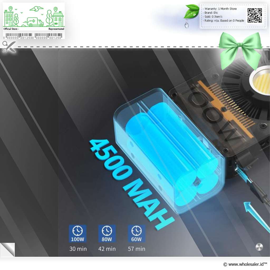 | Kapasitas Baterai | : | 4500 mAh 14.8 V (66.6 Wh) Grip Battery Runtime (Maximum Power) 30 Menit Grip Battery PD Charging Time 2 Jam 30 Menit Grip Battery QC Charging Time 4 Jam Adaptor Charging Time 3 Jam |
