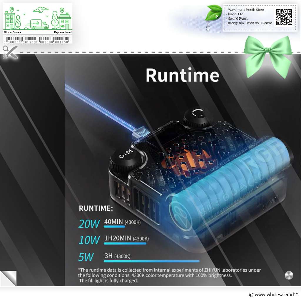 | Lain-lain | : | Waktu Penggunaan 20 W 40 Menit (4300 K) 10 W 1 Jam 20 Menit (4300 K) 5 W 3 Jam (4300 K) Dukungan Aplikasi Aplikasi Bluetooth ( ZY Vega APP) |